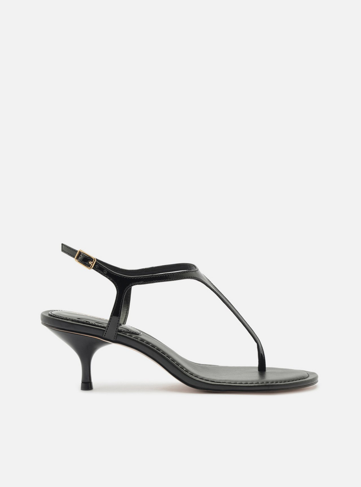 Sandália feminina preta em verniz. O sapato tem salto baixo fino e formato arredondado na ponta. Traz tira fina que passa entre os dedos, conectada a mais uma tira fina que contorna o tornozelo, com fecho em fivela metálica lateral. Com palmilha da cor da sandália e inscrição do nome da marca. Aberta, a sandália exibe todo o pé.