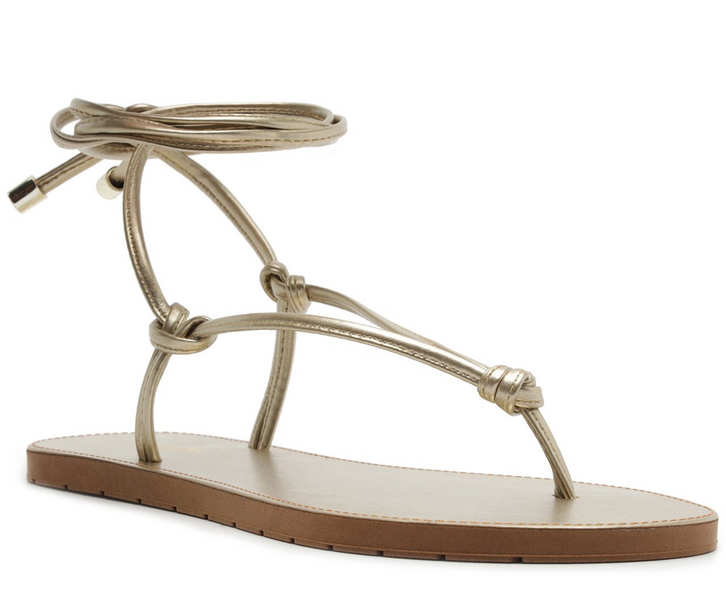 Sandália de dedo de amarração e detalhe em nó, na cor dourada. Possui uma tira central lisa, que passa entre os dedos e segue pelas laterais, arrematada em nozinhos, na parte central e nas laterais do modelo, com fecho por amarração no tornozelo com ponteiras metálicas. Apresenta solado emborrachado, com leve tratorado. Traz palmilha acolchoada, no mesmo tom da sandália, com assinatura Anacapri em carimbo metálico. Deixa os dedos, laterais e calcanhar à mostra.