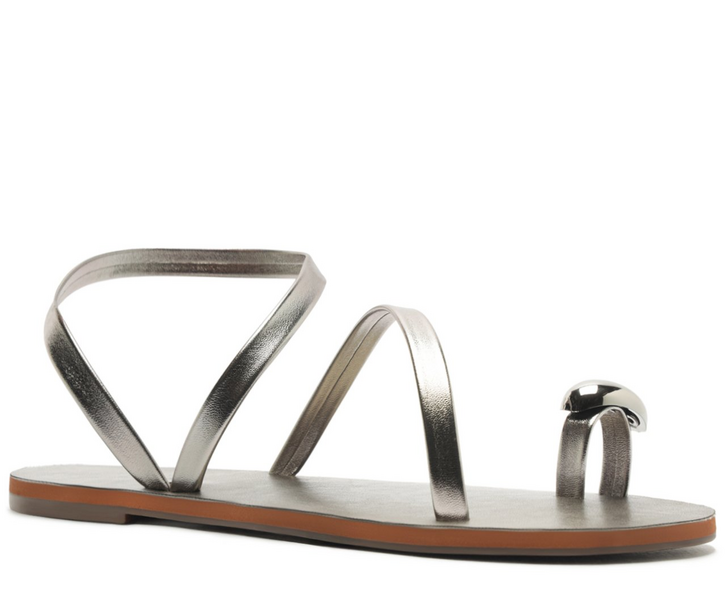 Rasteira de tiras finas com anel de dedo, na cor prateada. De material similar ao couro e biqueira arredondada, possui solado emborrachado, com leve saltinho traseiro. O modelo traz cabedal com trio de tirinhas: uma sobre o dedão com aplicação de adorno metálico estilo anel, outra que perpassa em curva no peito de pé presa na lateral e uma tira traseira elástica em meia cana transversal - que passa pelo tornozelo, contornando o calcanhar pela lateral, facilitando o calce de encaixe. Traz palmilha no mesmo tom da rasteirinha, com assinatura Anacapri.