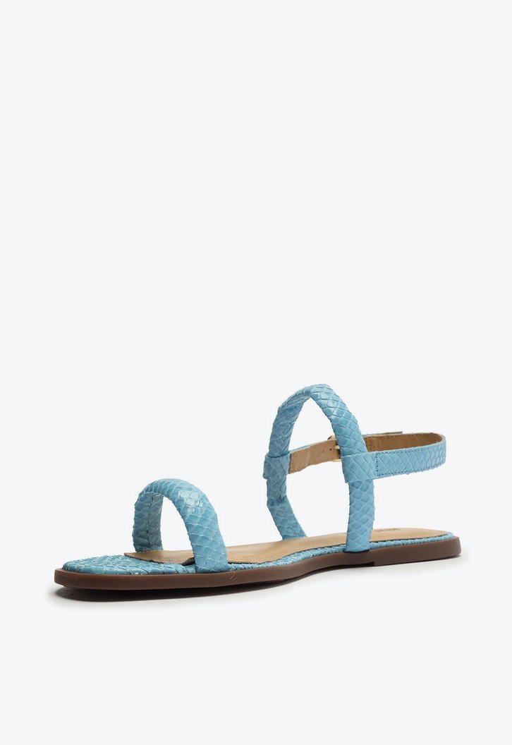 Sandália rasteira na cor azul com efeito de cobra e duas tiras finas na gáspea da pala. Um tira fina da mesma cor abraça o tornozelo e prende o modelo com uma fivela. Palmilha nude com o nome da marca. Deixa dedos, laterais e calcanhar à mostra.