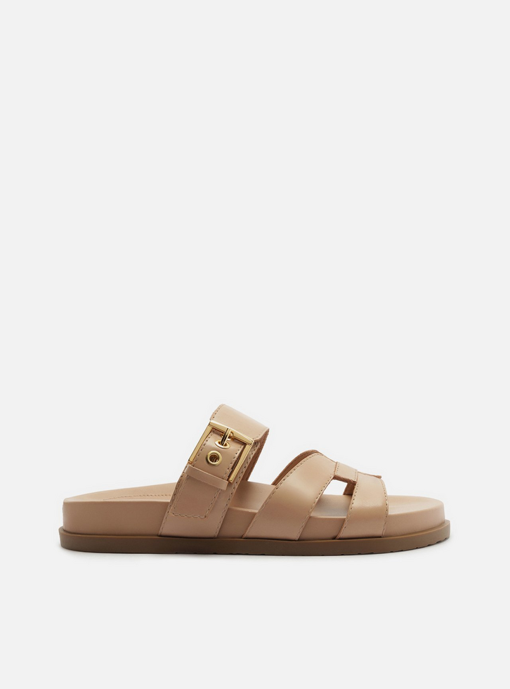 Sandália papete bege de couro. O sapato tem salto rasteiro, palmilha com formato anatômico e gravação do nome da marca. Possui solado flatform, base emborrachada e formato arredondado na ponta. Traz cabedal com tiras vazadas, além de costuras pesponto por todo o contorno. Possui tiras na parte superior do pé com fecho em fivela metálica lateral grande. Deixa parte do pé à mostra.