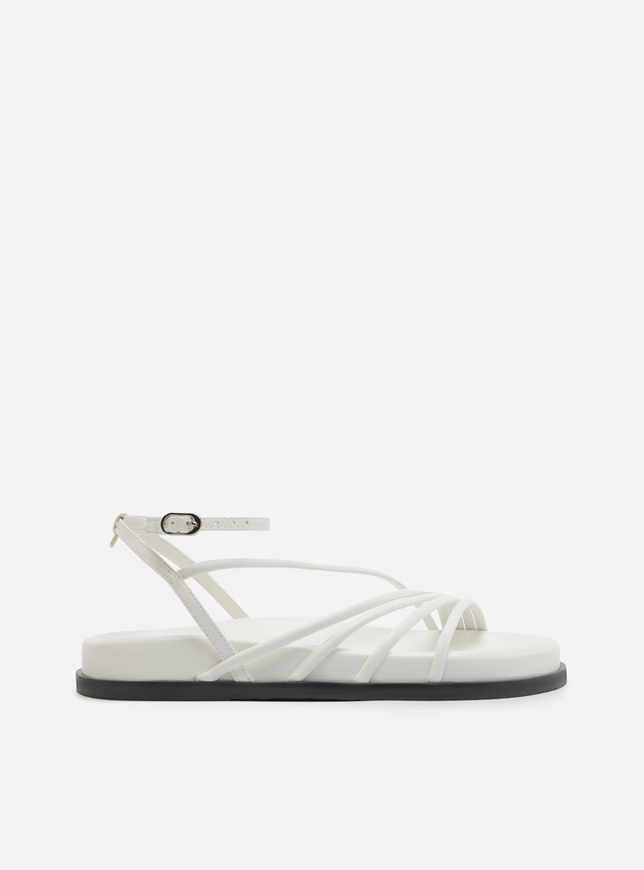 Sandália papete branca de couro. O modelo tem salto rasteiro, palmilha com formato anatômico e nome da marca. Possui solado flatform, base emborrachada e bico redondo. Traz tiras finas sobre os dedos e no peito do pé, na diagonal. Possui ainda tiras finas que saem das laterais, se cruzam no calcanhar, contornam o tornozelo e fecham em fivela. A sandália é aberta e exibe todo o pé.