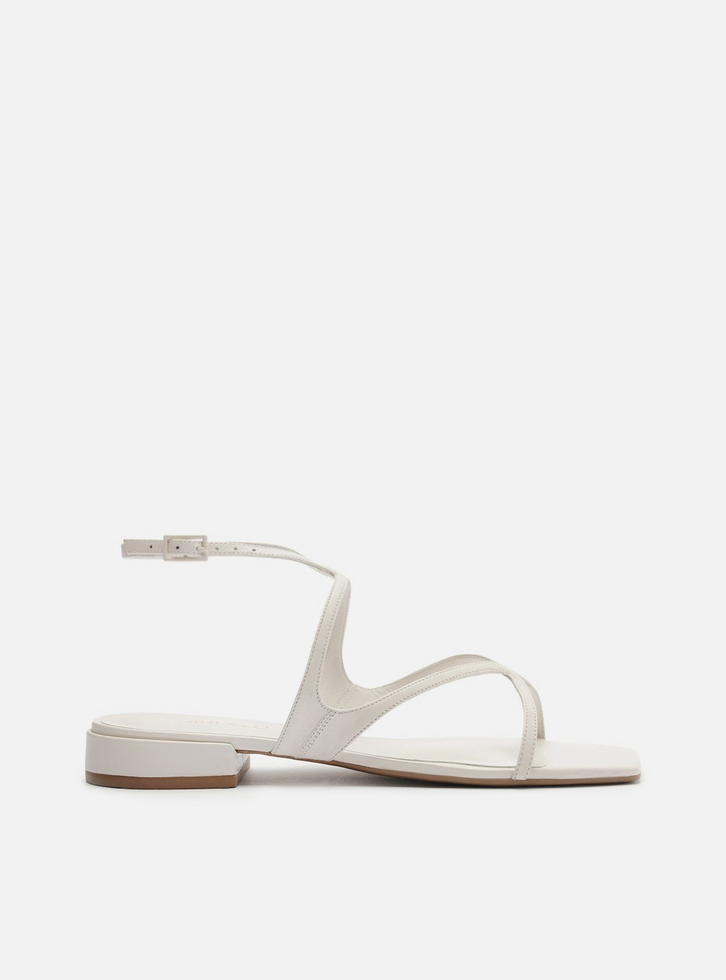 Sandália feminina branca de couro. O sapato tem salto mínimo bloco e formato quadrado na ponta. Traz duas tiras finas em X sobre os dedos e a parte superior do pé. Possui mais duas tiras finas que se cruzam no tornozelo, contornam o calcanhar e fecham em fivela lateral. Com palmilha lisa e inscrição do nome da marca. A sandália exibe todo o pé.