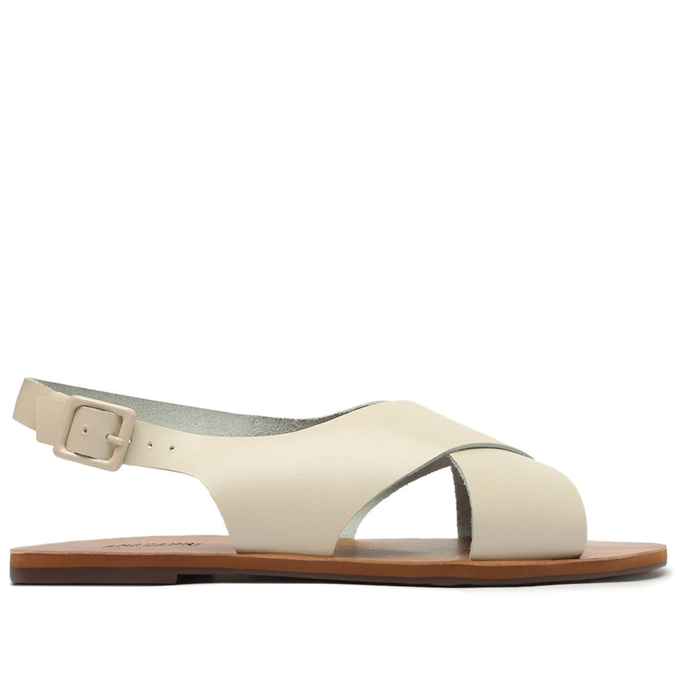 Sandália rasteira ANACAPRI de couro branca. Possui duas tiras largas na gáspea que se cruzam e seguem até a pala abraçando o tornozelo com uma tira mais fina com fecho em fivela. Palmilha nude com o nome da marca. Deixa dedos e calcanhar à mostra.