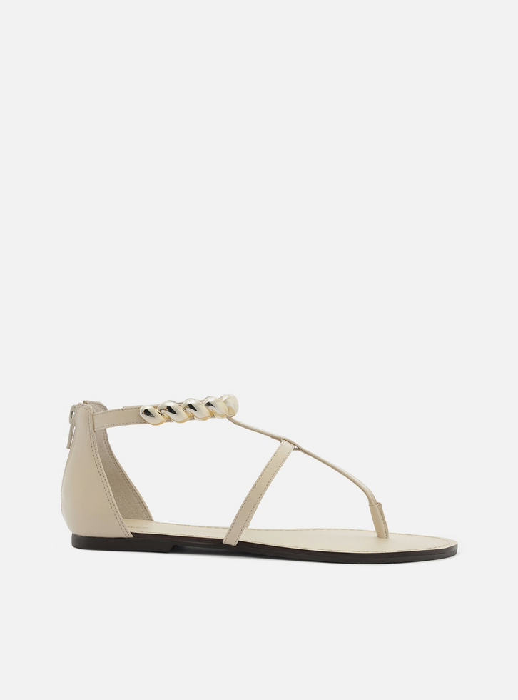 Sandália rasteira feminina branca em couro. O sapato tem sola flat e formato arredondado na ponta. Traz tira fina que divide os dedos, conectada à tira no tornozelo, com aplicação de metal dourado em efeito torcido. Fechada no calcanhar, possui zíper traseiro. Com palmilha da cor da sandália e inscrição Arezzo / Lenny Niemeyer. A sandália exibe todo o pé.