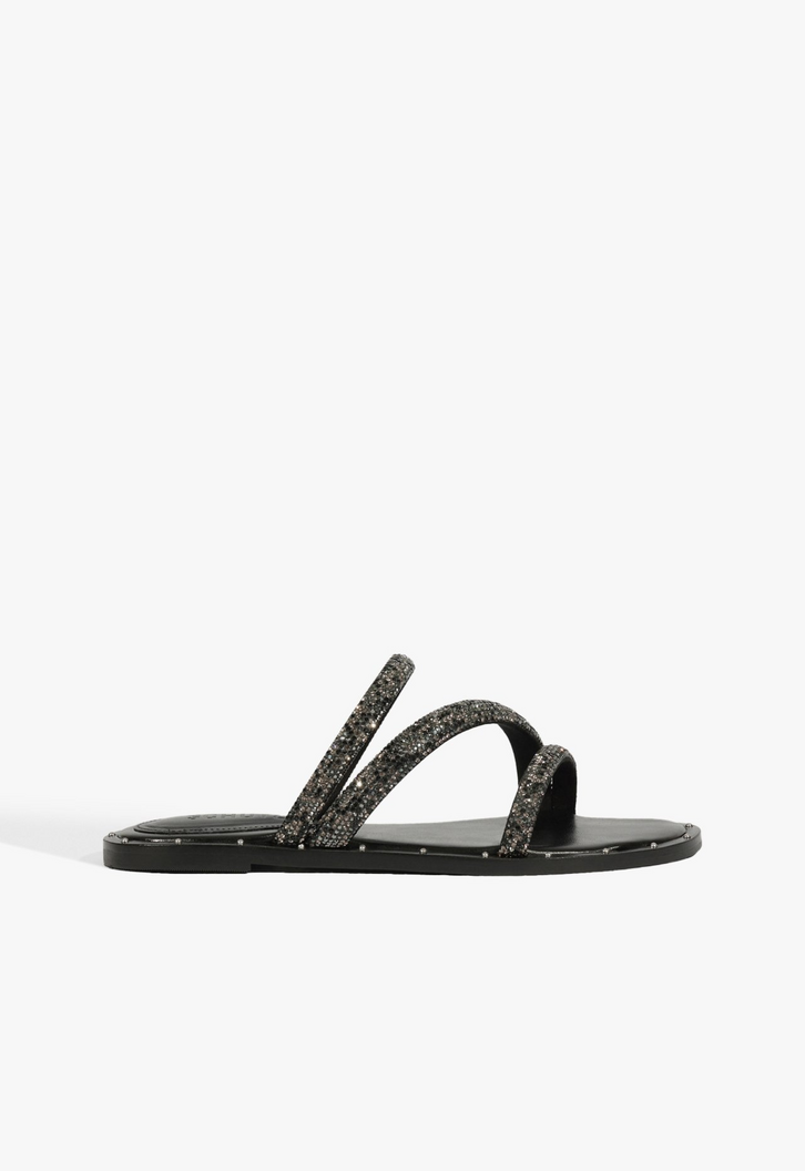 Essa sandália rasteira preta é a escolha perfeita para quem quer brilhar com leveza! Com três tiras assimétricas delicadas decoradas com strass e sola contornada por mini tachas, ela entrega um visual glamouroso sem abrir mão do conforto. Moderna e superestilosa, vai do look casual ao mais elaborado com facilidade. Aposte!