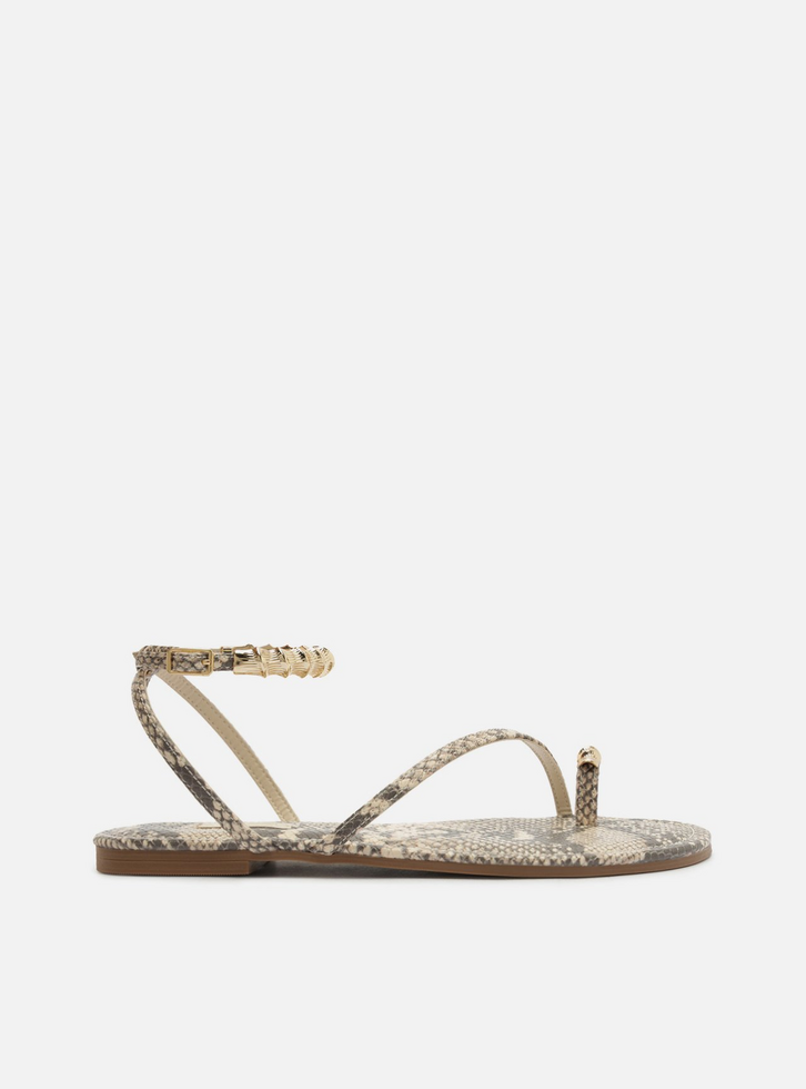 Sandália feminina cinza com estampa e textura snake. O sapato tem salto rasteiro e formato arredondado na ponta. Possui tira fina que cruza a parte superior do pé em diagonal, além de tira dedeira com aplicação de metais dourados. Traz tiras finas que saem das laterais, cruzam no calcanhar, contornam o tornozelo e fecham em fivela lateral, também com aplicação de metais dourados. Com palmilha estofada com estampa e tag do nome da marca.