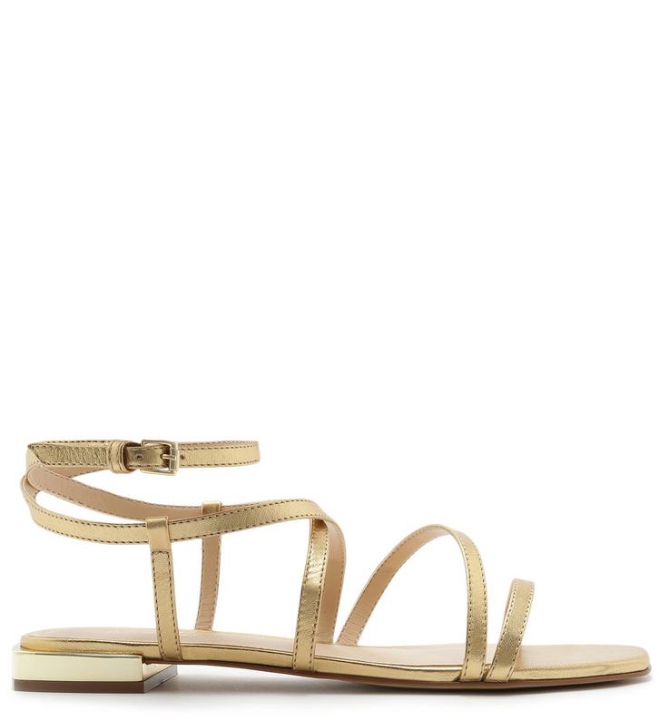 Sandália rasteira em couro metalizado dourado, com detalhe em metal no salto baixinho. De bico quadrado, o modelo possui tira sobre os dedos, outra transversal e duas tiras cruzadas no peito de pé passando pelas laterais, conectadas para fechamento superior em fivela regulável no tornozelo.