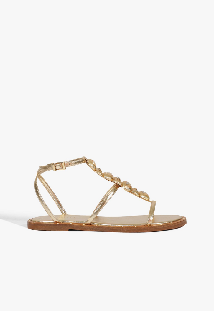 Essa sandália rasteira dourada em couro é puro glamour! Com três tiras delicadas que se encontram em uma peça central adornada por tachas metalizadas, ela é perfeita para completar o look com conforto e sofisticação. A sola também recebe aplicações de pequenas tachas, garantindo estilo em cada detalhe. Aposte!