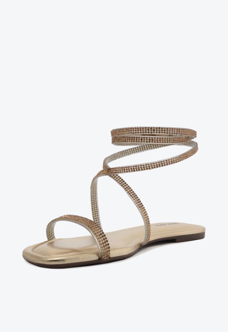 Sandália dourada Glam com amarrações. Com tiras brilhosas que se enrolam ao tornozelo, o modelo possui fecho em fivela e solado inteiramente flat.