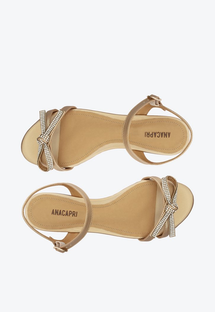 A sandália rasteira Anacapri dourada tem bico redondo e duas tiras sobre os dedos com detalhe de laço e strass. Fecho em fivela metálica lateral contornando calcanhar e tornozelo.