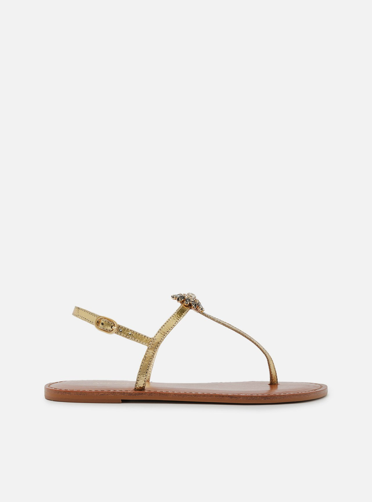 Sandália rasteira dourada de couro. O modelo slim tem sola flat e bico redondo. Traz tira fina que passa entre os dedos, conectada a mais uma tira fina no peito do pé, com aplicação de peça em pedrarias. Possui ainda tira fina em torno do calcanhar com fecho em fivela metálica lateral. Com palmilha marrom, contorno em pesponto e inscrição do nome da marca. Aberta, a sandália exibe todo o pé.