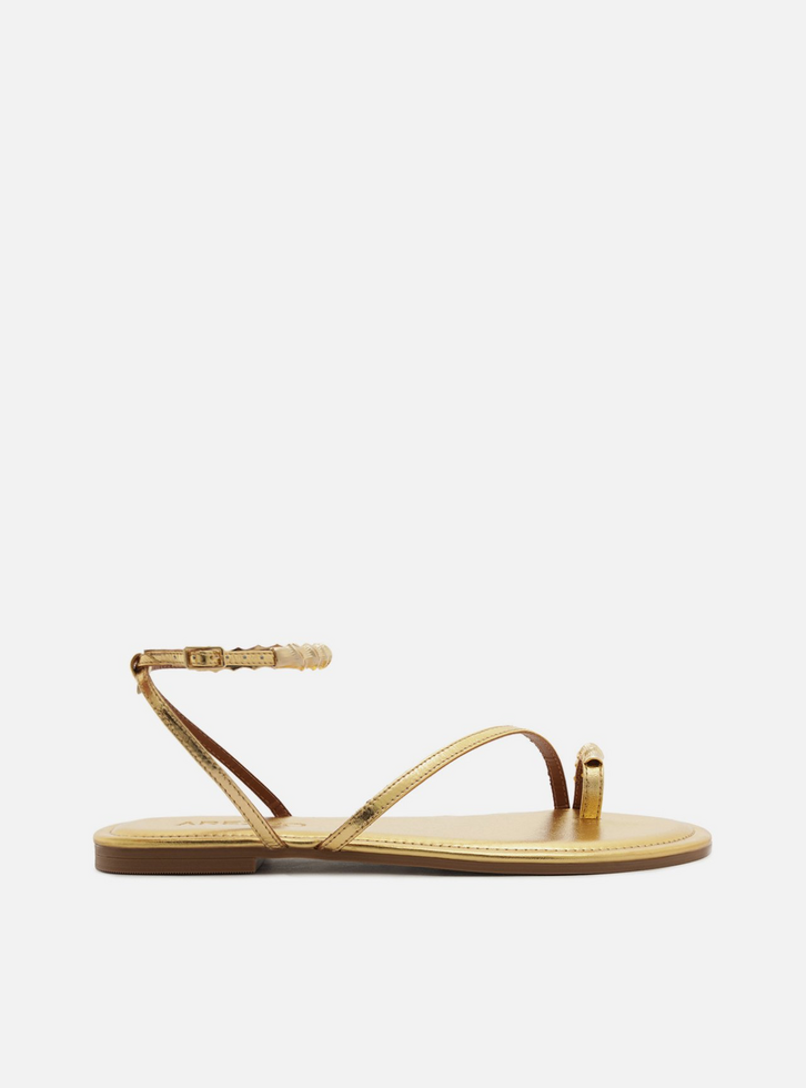 Sandália feminina dourada de couro. O sapato tem salto rasteiro e formato arredondado na ponta. Possui tira fina que cruza a parte superior do pé em diagonal, além de tira dedeira com aplicação de metais dourados. Traz tiras finas que saem das laterais, cruzam no calcanhar, contornam o tornozelo e fecham em fivela lateral, também com aplicação de metais dourados. Com palmilha estofada da cor da sandália e tag do nome da marca.
