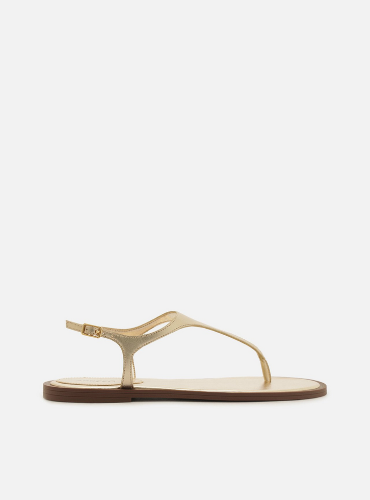 Sandália feminina dourada de couro. O sapato tem salto rasteiro e formato arredondado na ponta. Traz tira fina dividindo os dedos e tira afivelada em torno do tornozelo. Com palmilha da cor da sandália e inscrição do nome da marca. Acompanha tira tornozeleira em metal dourado com elos, presa na parte de trás.