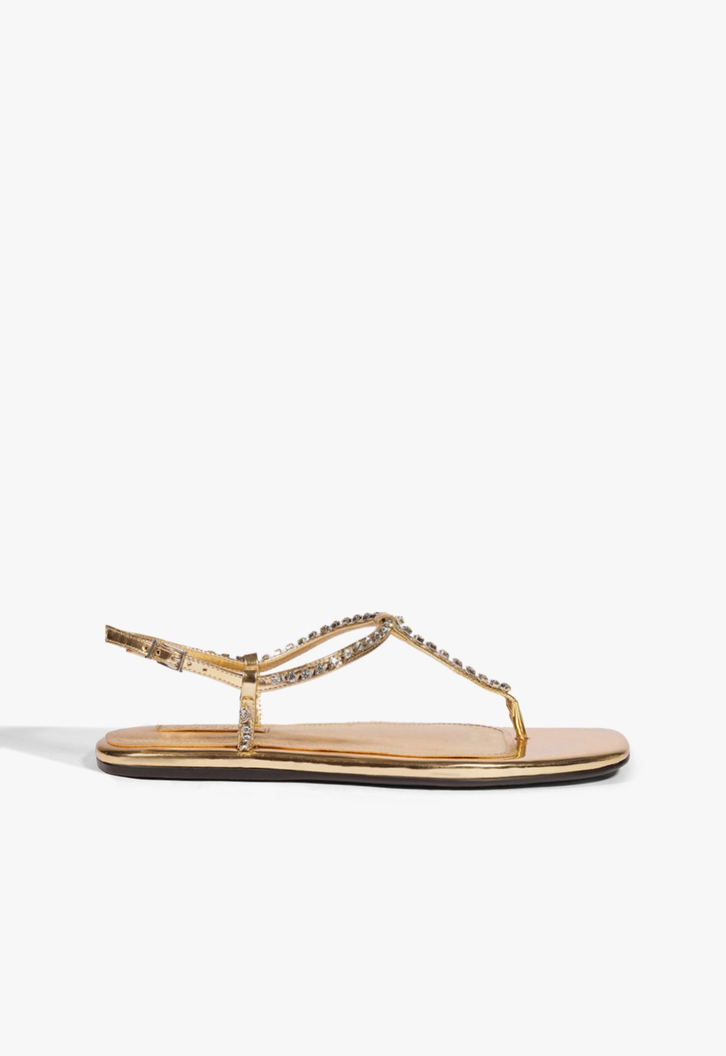 Adicione um toque de glamour ao seu visual com essa sandália rasteira de couro metalizado. A tira salomé no peito do pé e o fechamento em fivela no tornozelo trazem um ajuste estiloso e confortável. O bico redondo e o acabamento brilhante garantem um look sofisticado e moderno. Irresistível!
