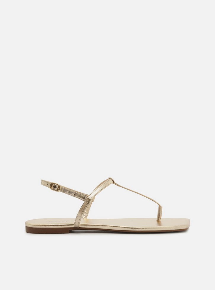 Sandália rasteira feminina dourada. O sapato tem sola flat e formato quadrado na ponta. Traz tira fina que passa entre os dedos, conectada a mais uma tira fina na horizontal na parte superior do pé. Possui ainda tira fina em torno do calcanhar com fecho em fivela metálica lateral. Com palmilha da cor da sandália e inscrição do nome da marca. Aberta, a sandália exibe todo o pé.
