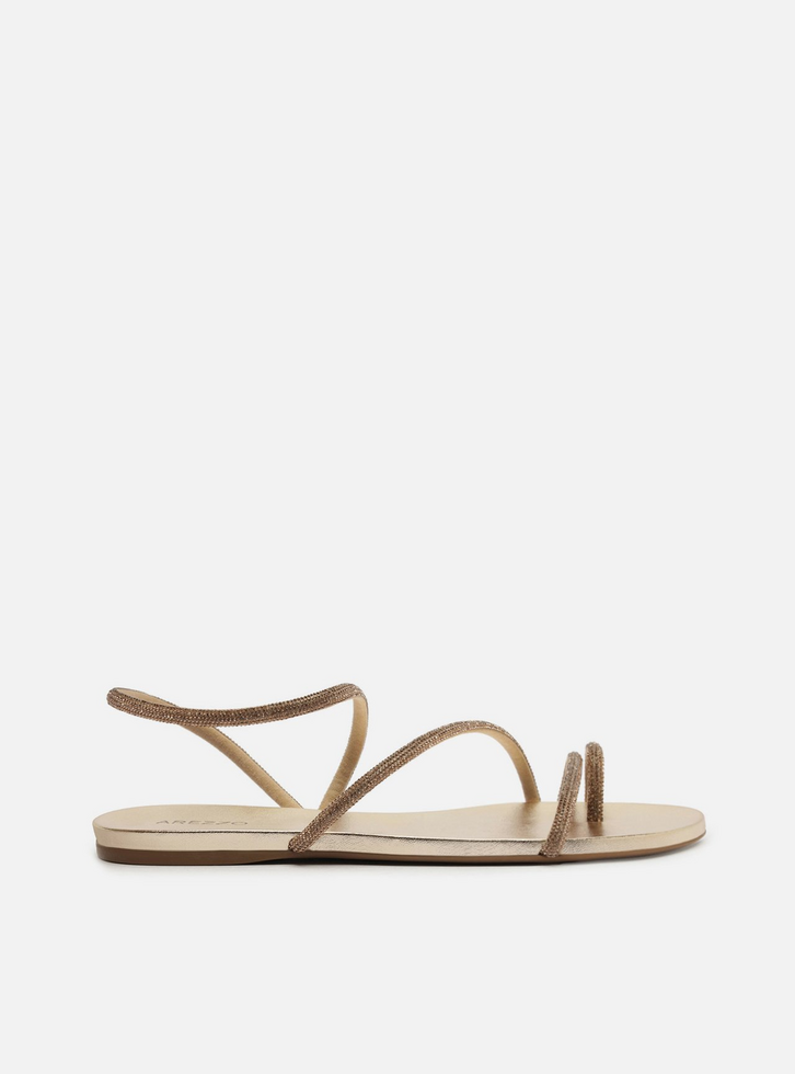 Sandália rasteira dourada. O sapato tem sola flat e formato arredondado na ponta. Possui tira fina que divide os dedos, tira sobre os dedos e outra na diagonal sobre a parte superior do pé, todas com aplicação de strass. Conta ainda com tira fina que contorna o tornozelo e fechamento até a lateral. Com palmilha da cor da sandália e inscrição do nome da marca. Aberta, exibe todo o pé.