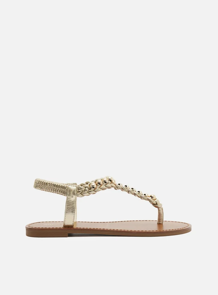 Sandália rasteira dourada. O sapato tem sola flat e formato arredondado na ponta. Traz tira trançada com aplicação de esferas metálicas douradas, que divide os dedos e segue até a parte superior do pé, contornando o tornozelo com elástico na parte traseira. Possui tiras laterais de suporte. Com palmilha marrom lisa, contorno em pesponto e inscrição do nome da marca.