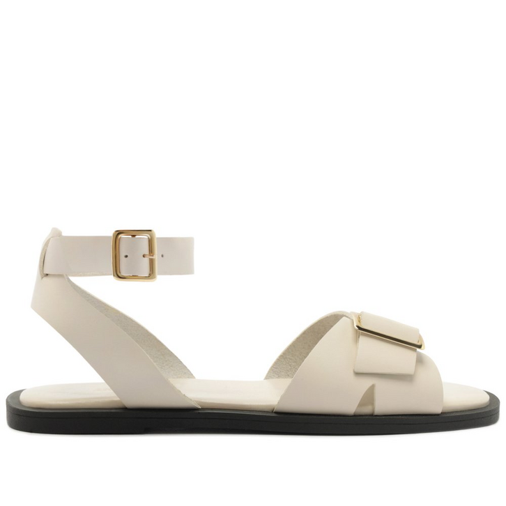 Sandália rasteira de tiras e detalhe em fivela, na cor branca. O modelo de biqueira quadrada possui solado emborrachado, com leve saltinho traseiro. Traz cabedal com tira mais larga e design de recorte vazado sobre os dedos, com aplicação de maxi fivela metálica, com shape quadrado. Traz tira traseira que contorna o calcanhar, que se conecta à tira no tornozelo, com fechamento superior afivelado pela lateral. Apresenta palmilha comfy acolchoada, no mesmo tom da sandália, com assinatura Anacapri em carimbo metálico.
