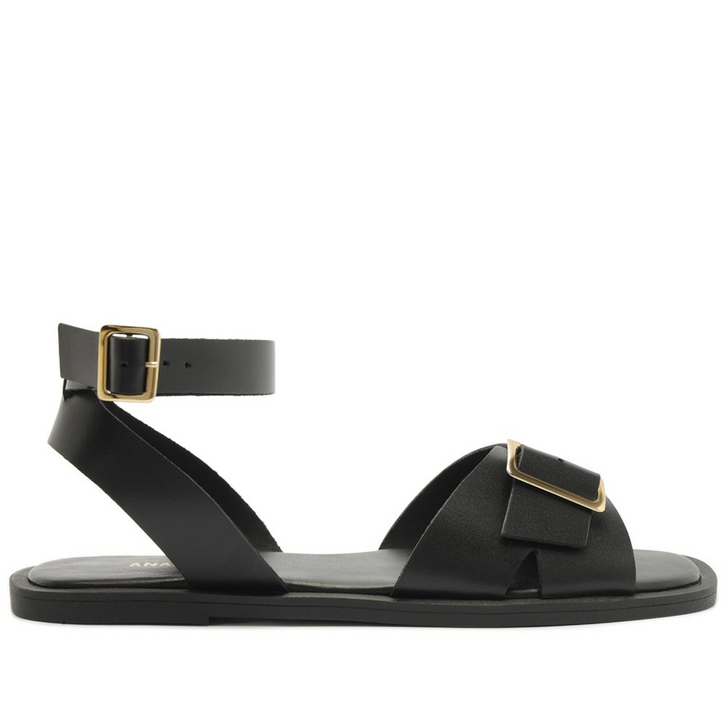 Sandália rasteira de tiras e detalhe em fivela, na cor preta. O modelo de biqueira quadrada possui solado emborrachado, com leve saltinho traseiro. Traz cabedal com tira mais larga e design de recorte vazado sobre os dedos, com aplicação de maxi fivela metálica, com shape quadrado. Traz tira traseira que contorna o calcanhar, que se conecta à tira no tornozelo, com fechamento superior afivelado pela lateral. Apresenta palmilha comfy acolchoada, no mesmo tom da sandália, com assinatura Anacapri em carimbo metálico.