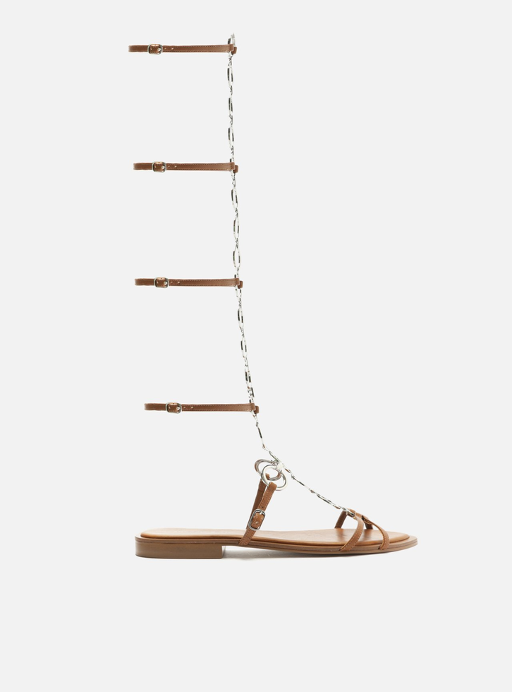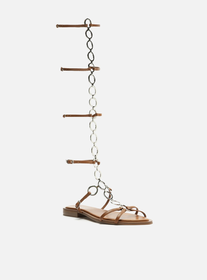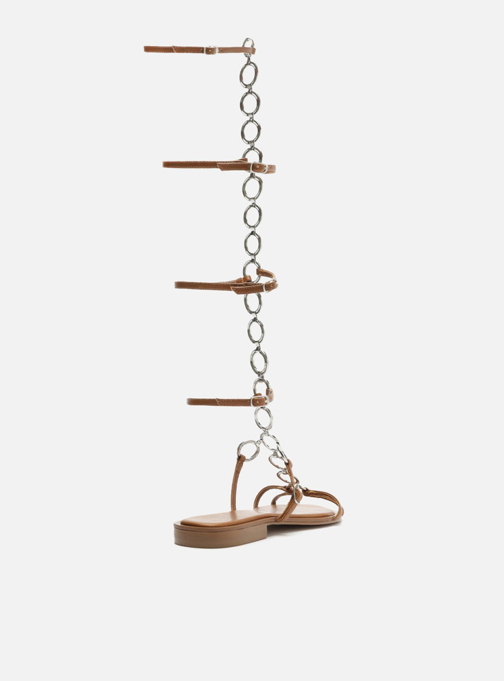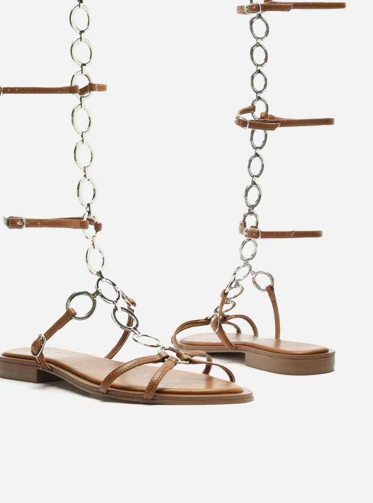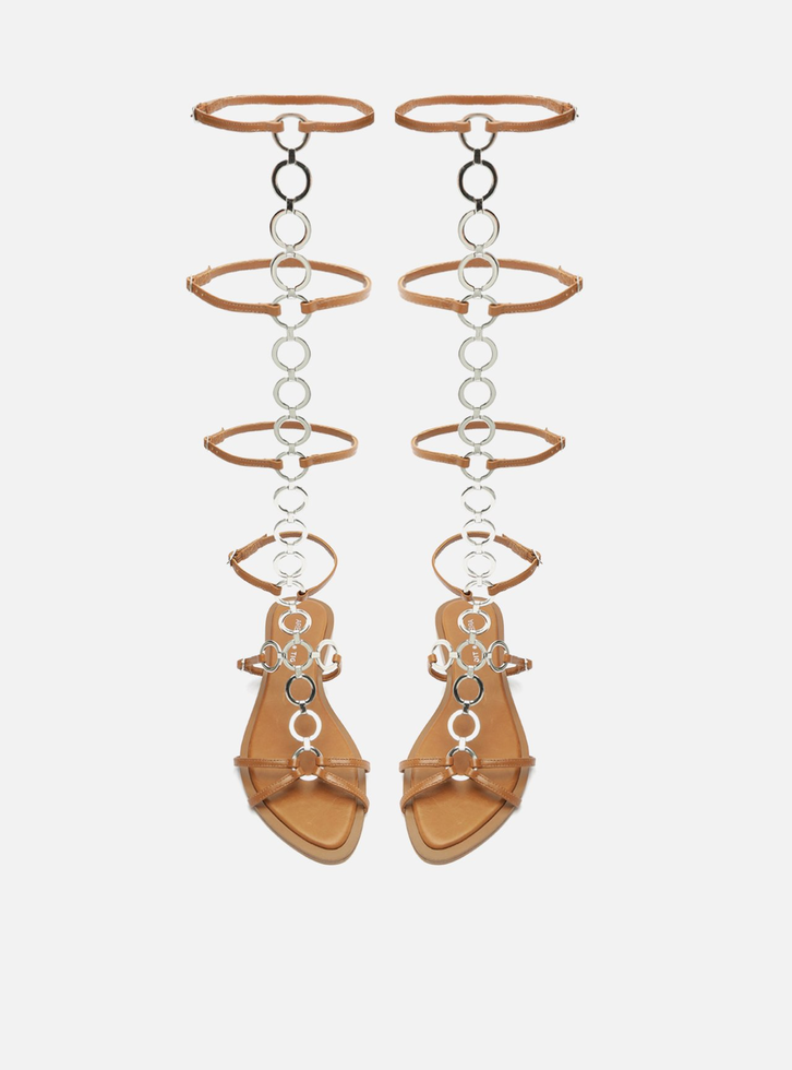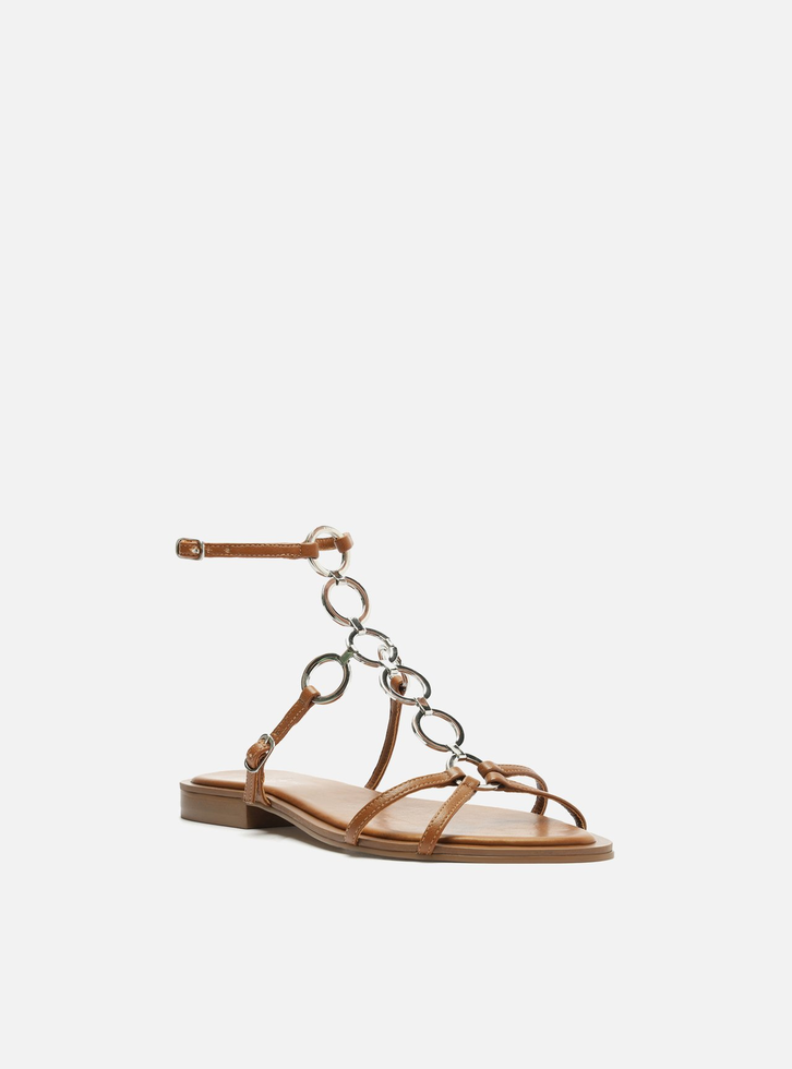 Sandália marrom em couro. O sapato tem salto rasteiro e formato arredondado na ponta. Traz tira dividindo os dedos e tiras na parte superior do pé, todas conectadas por peças redondas e vazadas em metal no centro - uma das tiras fecha em fivela metálica. Possui tira fina, conectada às peças de metal, que contorna o tornozelo e fecha em fivela metálica. Com palmilha lisa da cor da sandália e inscrição Arezzo + TIG.