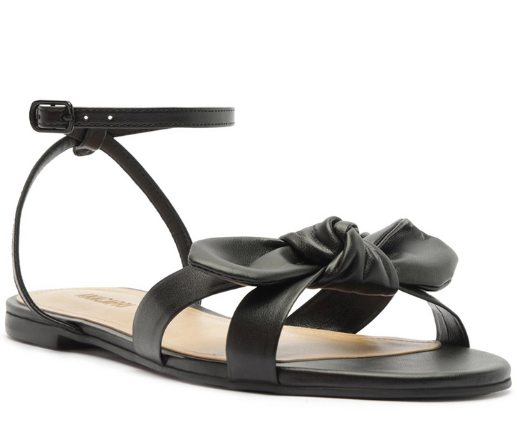 Sandália rasteira com detalhe em laço, na cor preta. O modelo de material similar ao couro e biqueira arredondada, possui solado rasteiro e emborrachado, com leve saltinho traseiro. Apresenta cabedal com duas tiras vazadas sobre os dedos, com arremate imponente central em maxi nó, unindo as tiras na gáspea. Apresenta tira traseira que contorna o calcanhar, que se conecta na tira superior, com fecho afivelado na lateral do tornozelo. Traz palmilha acolchoada no mesmo tom da sandália, com assinatura Anacapri.