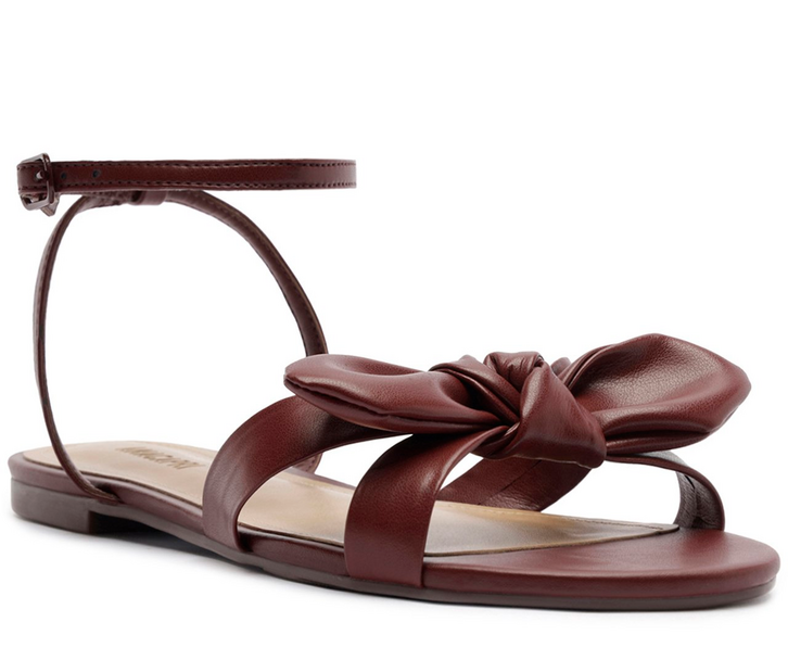 Sandália rasteira com detalhe em laço, na cor vermelha. O modelo de material similar ao couro e biqueira arredondada, possui solado rasteiro e emborrachado, com leve saltinho traseiro. Apresenta cabedal com duas tiras vazadas sobre os dedos, com arremate imponente central em maxi nó, unindo as tiras na gáspea. Apresenta tira traseira que contorna o calcanhar, que se conecta na tira superior, com fecho afivelado na lateral do tornozelo. Traz palmilha acolchoada no mesmo tom da sandália, com assinatura Anacapri.