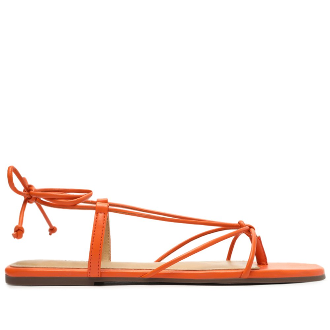 Sandália rasteira laranja com biqueira quadrada. Possui duas tiras finas na gáspea que se unem no meio e dividem os dedos. Do centro delas saem mais duas tiras que seguem até a pala pelas laterais do pé e sobem pra amarração no tornozelo. Palmilha nude com o nome da marca. Deixa dedos, laterais e calcanhar à mostra.