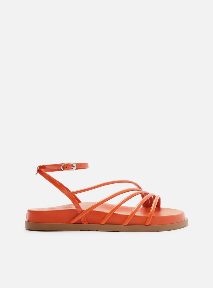 Sandália papete laranja de couro. O sapato tem salto rasteiro, palmilha com formato anatômico e nome da marca. Possui solado flatform, base emborrachada e formato arredondado na ponta. Traz tiras finas sobre os dedos e a parte superior do pé, na diagonal. Possui ainda tiras finas que saem das laterais, se cruzam no calcanhar, contornam o tornozelo e fecham em fivela. A sandália é aberta e exibe todo o pé.