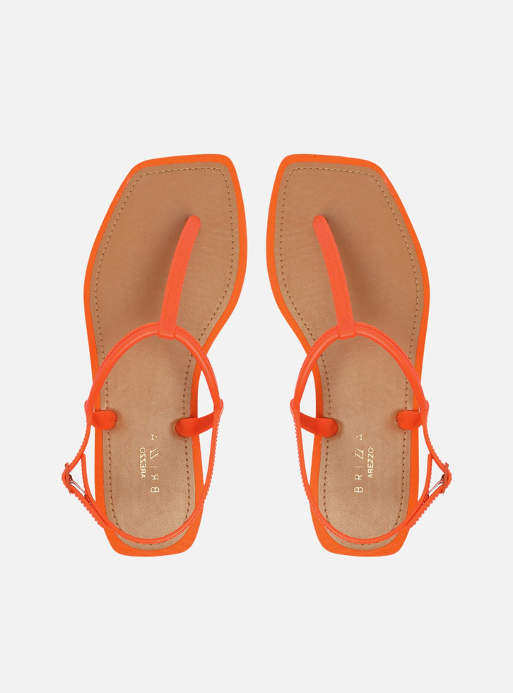 Sandália rasteira laranja. O modelo tem sola flat em borracha e palmilha marrom lisa com contorno em costura pesponto e nome da marca. De bico quadrado, traz tira fina injetada que passa entre os dedos, conectada a mais uma tira fina no peito do pé. Possui ainda tira fina em torno do calcanhar com fecho em fivela metálica lateral. Aberta, a sandália exibe todo o pé.