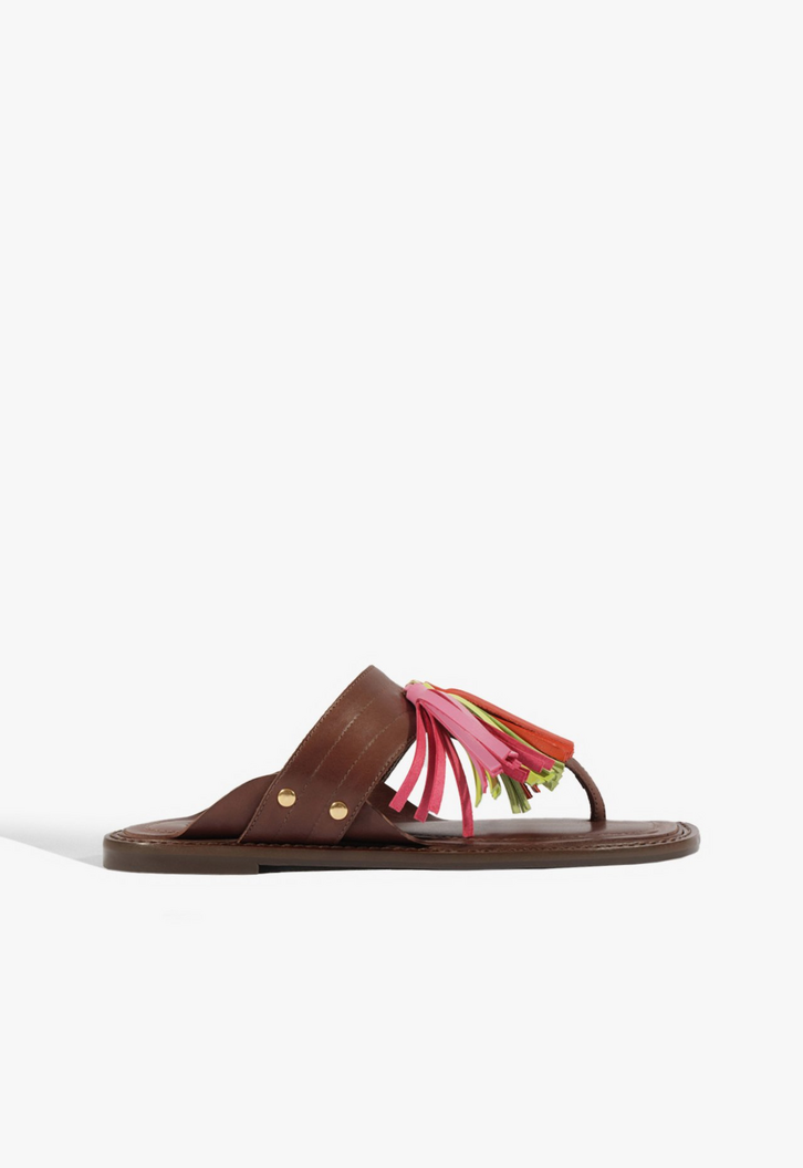 A rasteira em couro que é a cara do verão! A Sandália Maribel combina o conforto do couro macio com o charme inconfundível do maxi-tassel colorido. Use-a com vestidos longos ou mídi, de preferência em tecidos leves e esvoaçantes, para um look boho-chic perfeito para fins de semana ou happy hour.