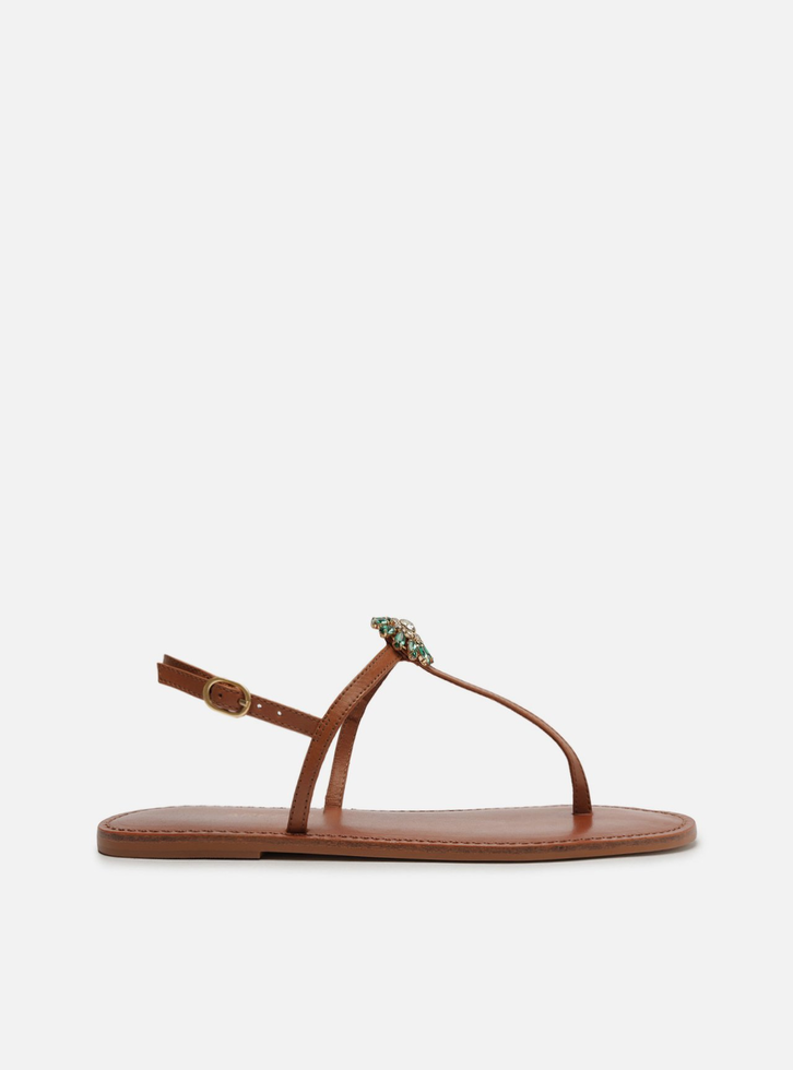 Sandália rasteira marrom de couro. O modelo slim tem sola flat e bico redondo. Traz tira fina que passa entre os dedos, conectada a mais uma tira fina no peito do pé, com aplicação de peça em pedrarias. Possui ainda tira fina em torno do calcanhar com fecho em fivela metálica lateral. Com palmilha marrom, contorno em pesponto e inscrição do nome da marca. Aberta, a sandália exibe todo o pé.