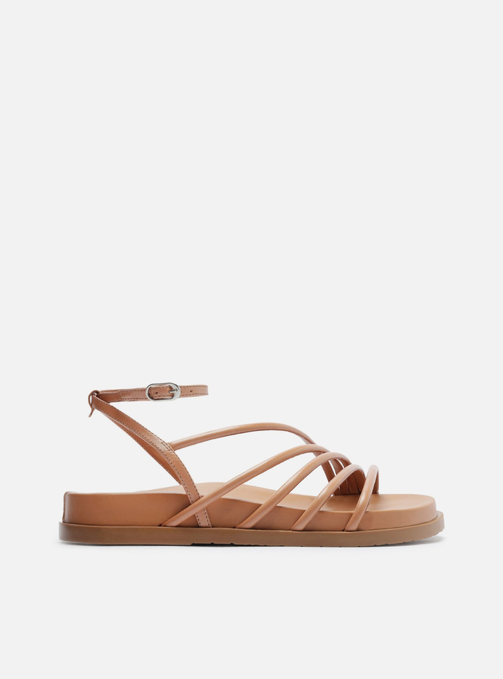 Sandália papete marrom de couro. O sapato tem salto rasteiro, palmilha com formato anatômico e nome da marca. Possui solado flatform, base emborrachada e formato arredondado na ponta. Traz tiras finas sobre os dedos e a parte superior do pé, na diagonal. Possui ainda tiras finas que saem das laterais, se cruzam no calcanhar, contornam o tornozelo e fecham em fivela. A sandália é aberta e exibe todo o pé.
