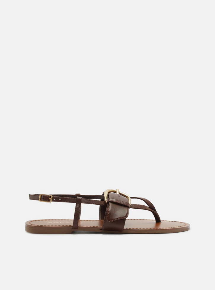 Sandália rasteira feminina marrom de couro. O sapato tem sola rasteira flat e formato arredondado na ponta. Traz tiras finas que dividem os dedos e seguem até o calcanhar, com fechamento por fivela metálica. Possui ainda tira média sobreposta na horizontal, com fivela metálica dourada grande para regulagem. Com palmilha da cor do sapato e inscrição do nome da marca.