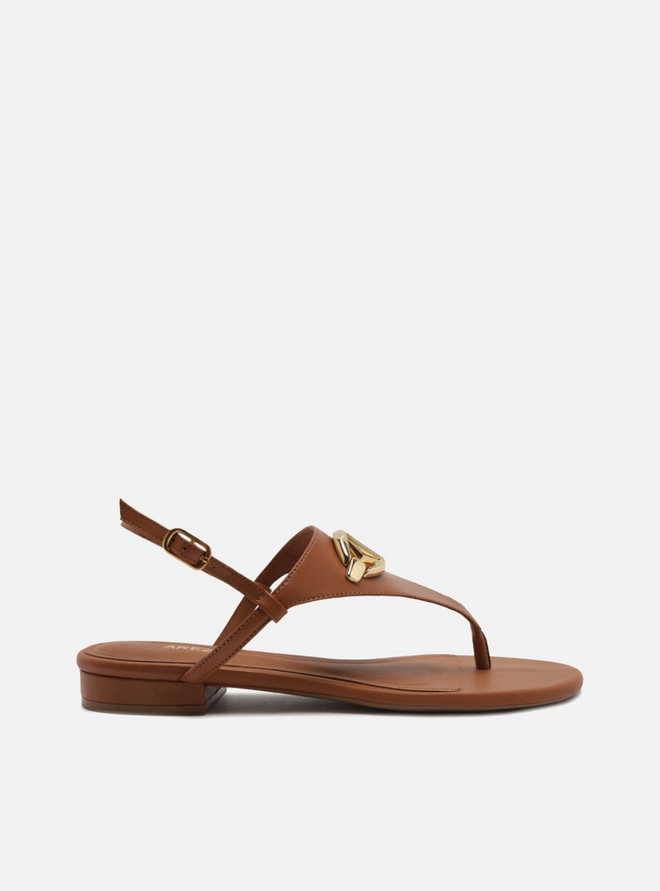 Sandália rasteira feminina marrom em couro. O sapato tem sola flat e formato arredondado na ponta. Traz tira larga dividindo os dedos, em formato triangular, que cobre parcialmente a parte superior do pé, com aplicação de metal dourado. Possui ainda tira fina em torno do calcanhar com fecho em fivela metálica lateral. Com palmilha lisa, contorno em pesponto e inscrição do nome da marca.