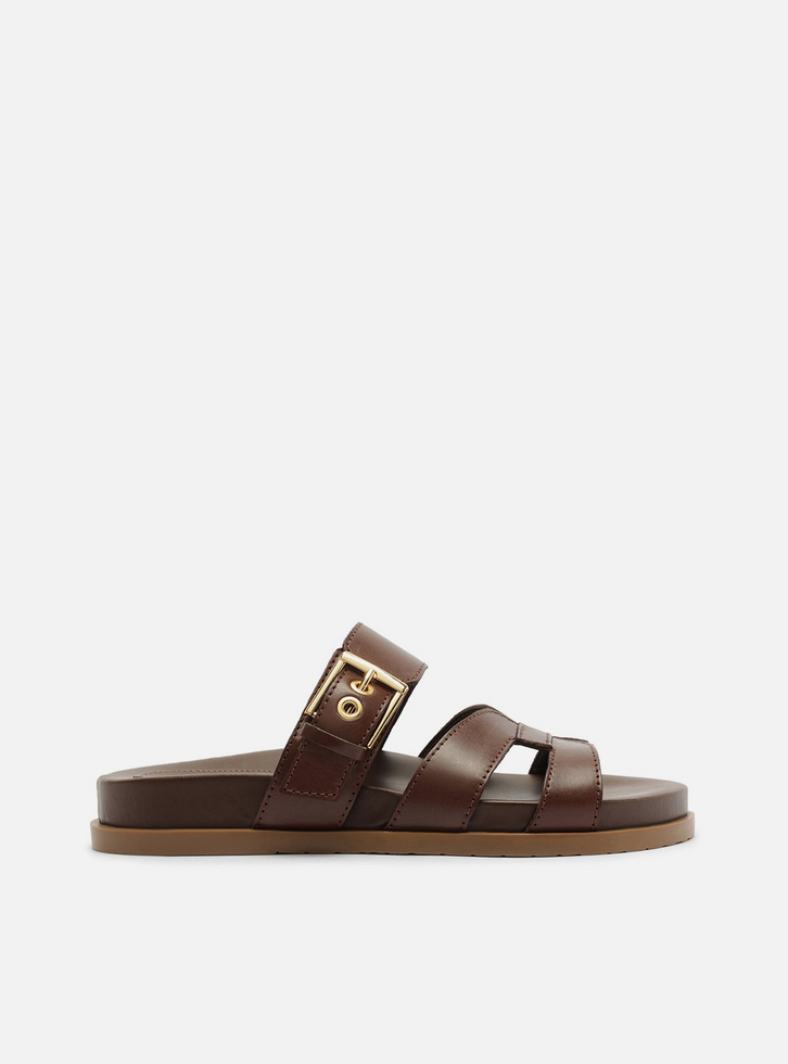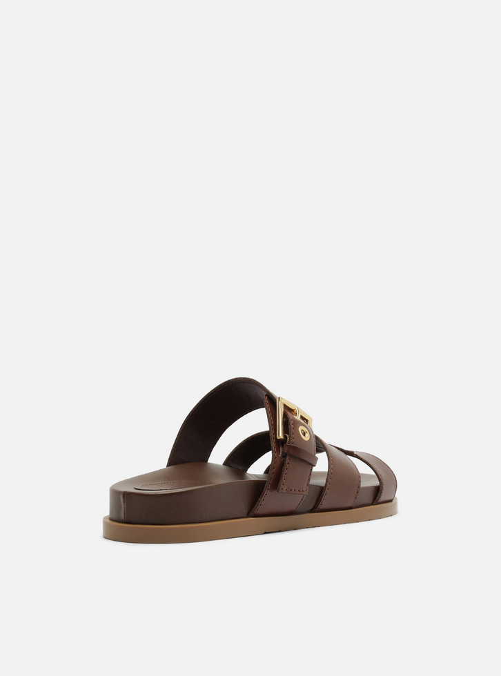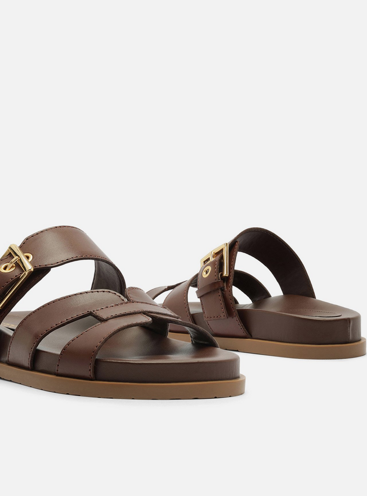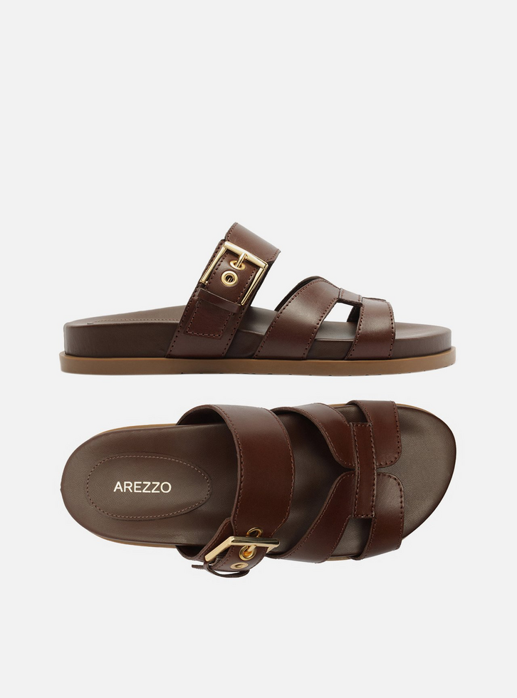 Sandália papete marrom de couro. O sapato tem salto rasteiro, palmilha com formato anatômico e gravação do nome da marca. Possui solado flatform, base emborrachada e formato arredondado na ponta. Traz cabedal com tiras vazadas, além de costuras pesponto por todo o contorno. Possui tiras na parte superior do pé com fecho em fivela metálica lateral grande. Deixa parte do pé à mostra.
