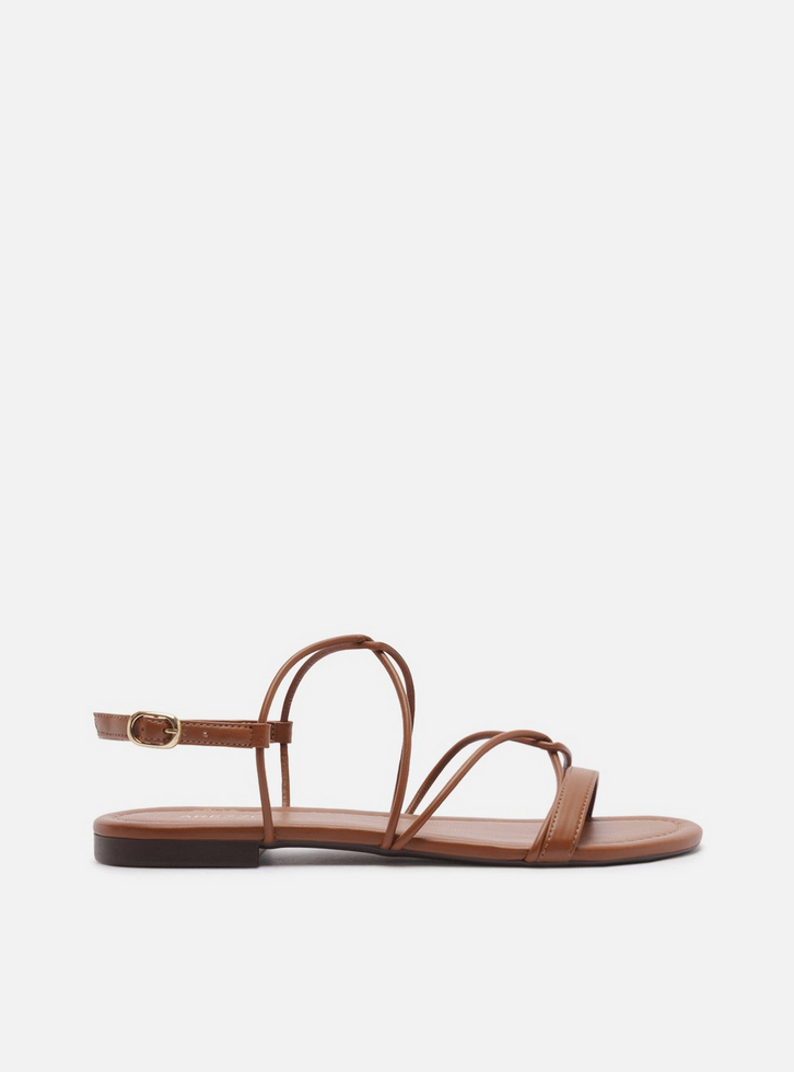 Sandália rasteira marrom. O sapato tem sola flat e formato arredondado na ponta. Traz tiras finas sobre a parte superior do pé e os dedos, cruzadas no centro e presas por enlace. Possui tira sobre os dedos e tira afivelada em torno do calcanhar. Aberta, a sandália exibe todo o pé.
