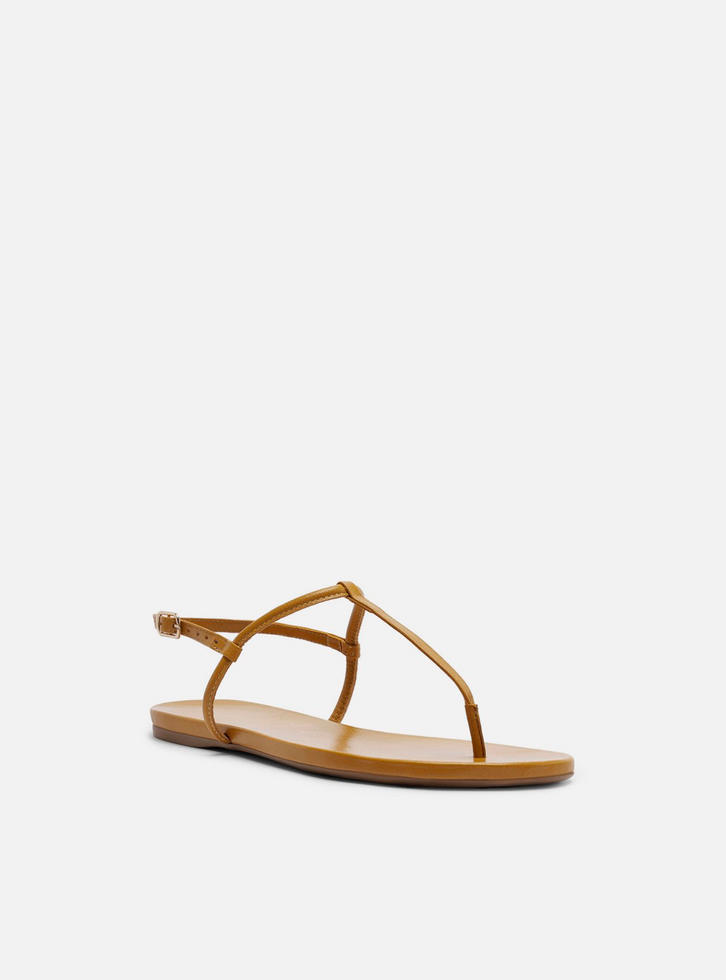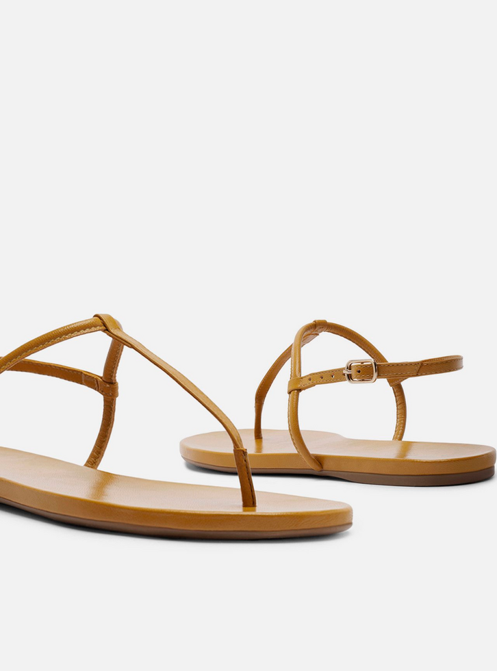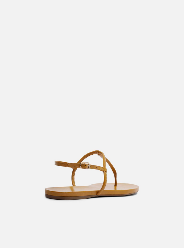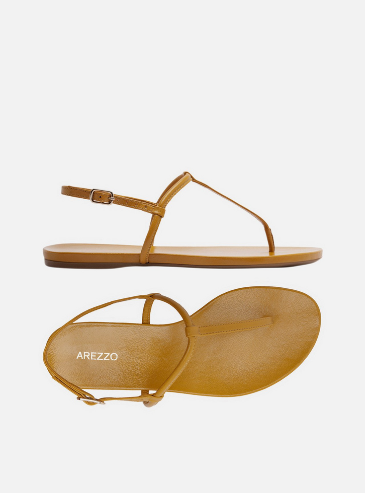 Sandália rasteira feminina amarela. O sapato slim tem sola flat e formato arredondado na ponta. Traz tira fina que passa entre os dedos, conectada a mais uma tira fina na horizontal. Possui ainda tira fina em torno do calcanhar com fecho em fivela metálica lateral. Com palmilha da cor da sandália e inscrição do nome da marca. Aberta, a sandália exibe todo o pé.