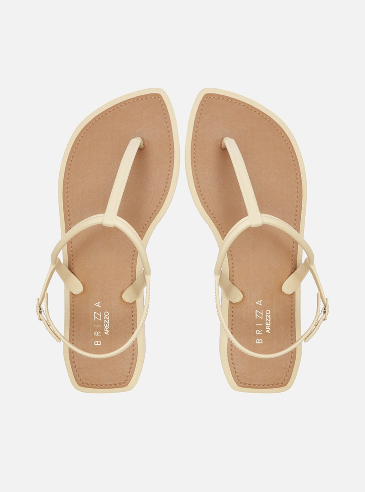 Sandália rasteira Off-white. O modelo tem sola flat em borracha e palmilha marrom lisa com contorno em costura pesponto e nome da marca. De bico folha, traz tira fina injetada que passa entre os dedos, conectada a mais uma tira fina no peito do pé. Possui ainda tira fina em torno do calcanhar com fecho em fivela metálica lateral. Aberta, a sandália exibe todo o pé.