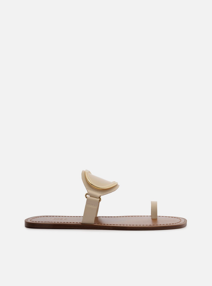 Sandália rasteira feminina off-white de couro. O sapato tem sola flat e formato arredondado na ponta. Traz tira fina dedeira e tira na parte superior do pé com formato ovalado no centro e aplicação de metal ovalado e vazado sobreposto, além de passadores nas laterais. Com palmilha marrom, contorno em pesponto e inscrição do nome da marca.