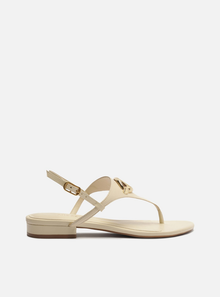 Sandália rasteira feminina off-white em couro. O sapato tem sola flat e formato arredondado na ponta. Traz tira larga dividindo os dedos, em formato triangular, que cobre parcialmente a parte superior do pé, com aplicação de metal dourado. Possui ainda tira fina em torno do calcanhar com fecho em fivela metálica lateral. Com palmilha lisa, contorno em pesponto e inscrição do nome da marca.
