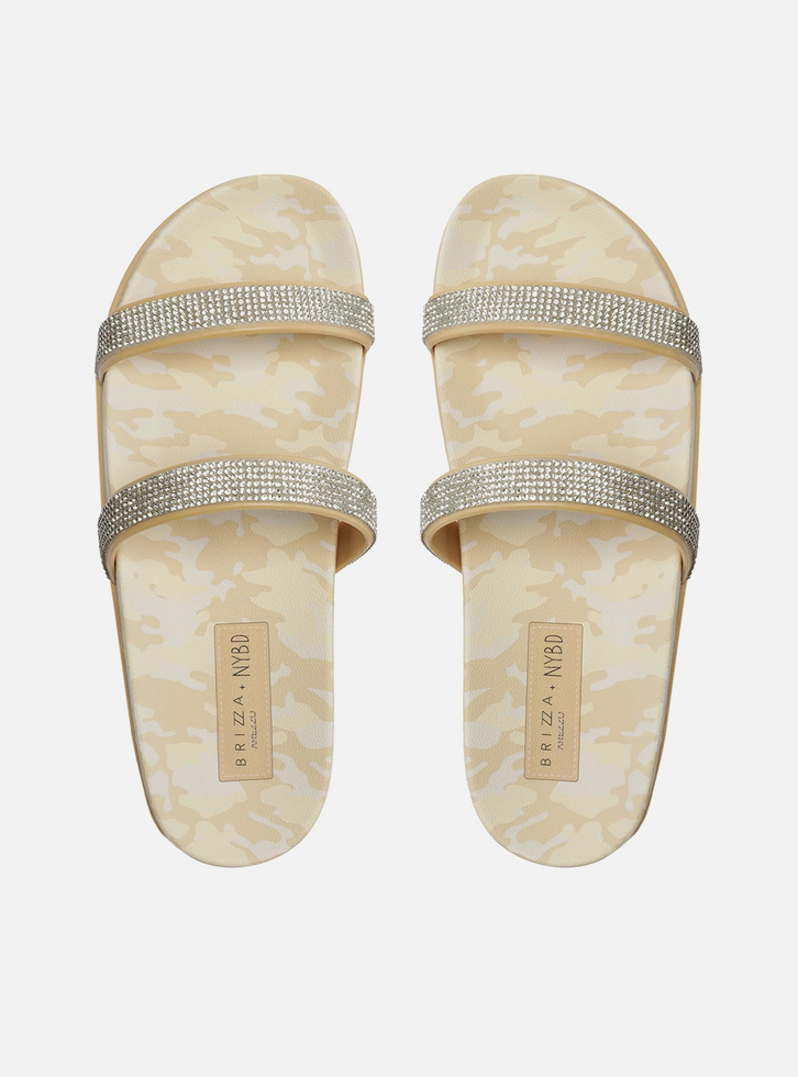 Sandália rasteira Off-white. O modelo tem palmilha com formato anatômico e inscrição do nome da marca. Possui base emborrachada tratorada e bico redondo. Traz tiras com strass sobre os dedos e o peito do pé. A sandália é aberta e exibe todo o pé.