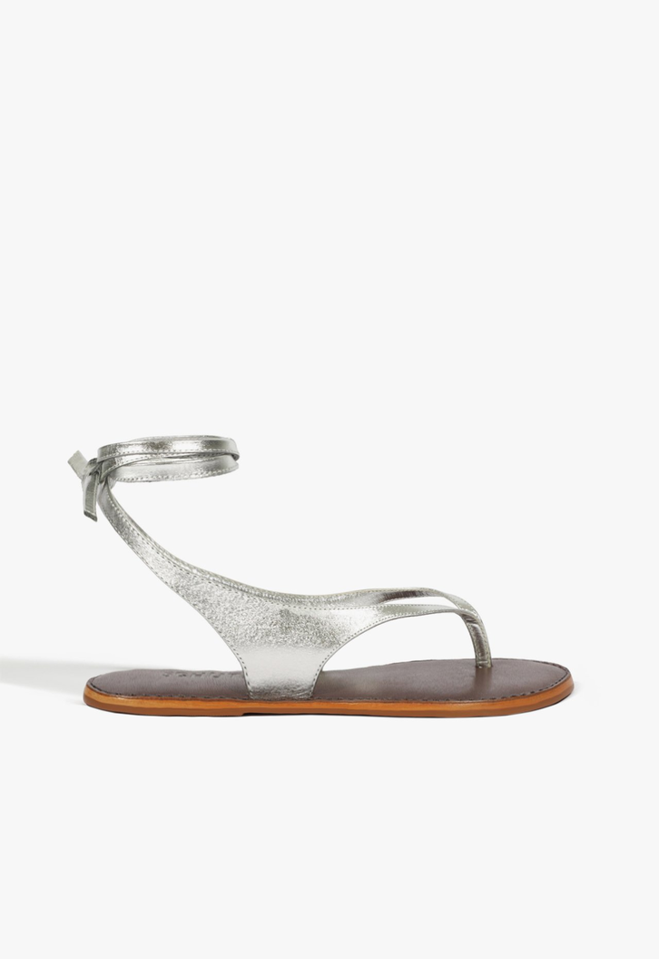 Essa confortável sandália rasteira prata traz uma proposta sexy e sofisticada para seus looks de verão! O design clean em couro metalizado traz elegância imediata, enquanto as tiras tipo thong sandal e o fechamento com amarração de fita no tornozelo deixam esse modelo super cool. Aposte!