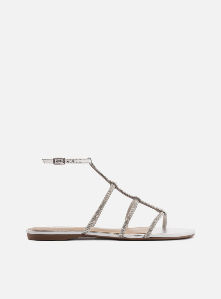 Sandália rasteira prata com aplicação de strass. O sapato tem sola flat e formato arredondado na ponta. Traz tiras finas no cabedal, sobre os dedos e a parte superior do pé, sendo uma central e as demais horizontais, todas conectadas. Possui tira em torno do tornozelo fechando em fivela lateral. Com palmilha bege e inscrição do nome da marca. Aberta, a sandália exibe todo o pé.
