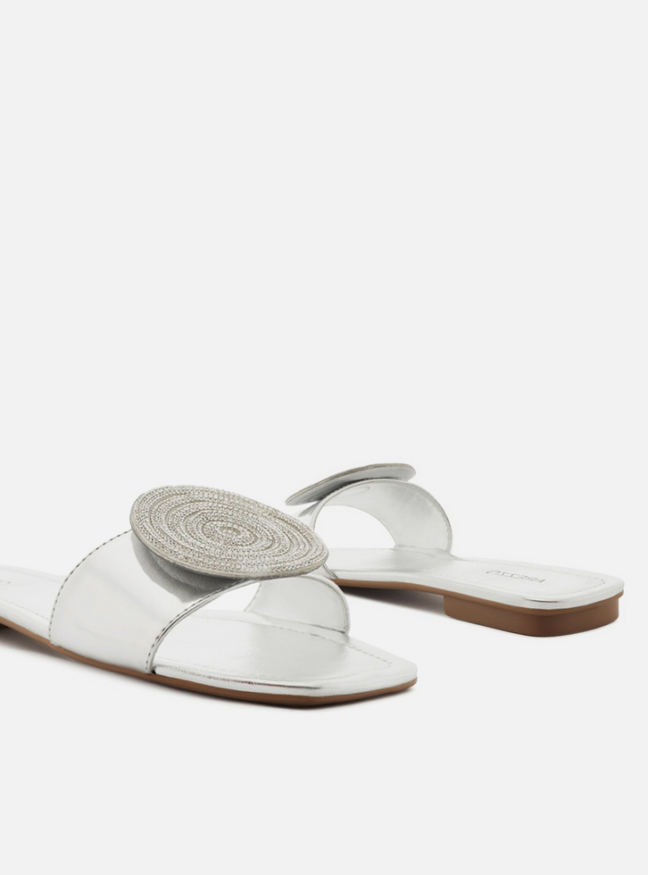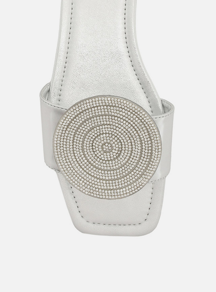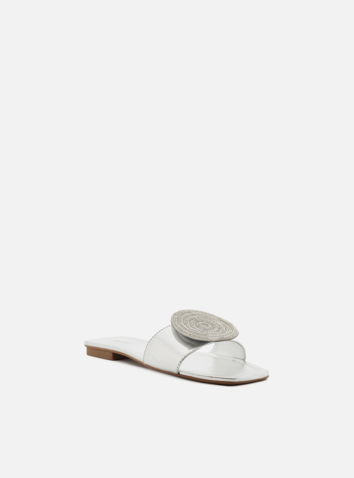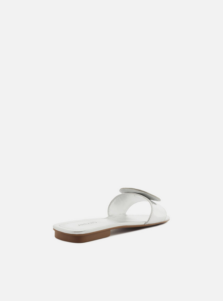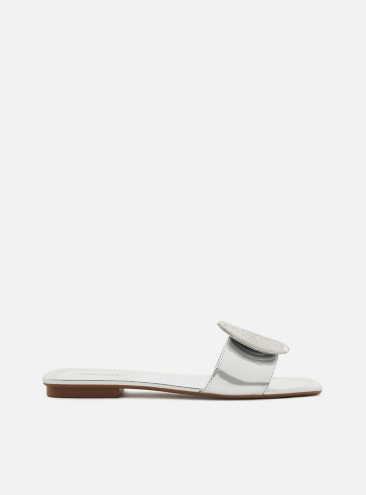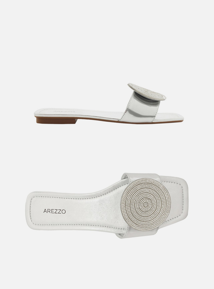 Sandália rasteira prata. Possui tira larga enfeite redondo. Logotipo da Arezzo na palmilha.