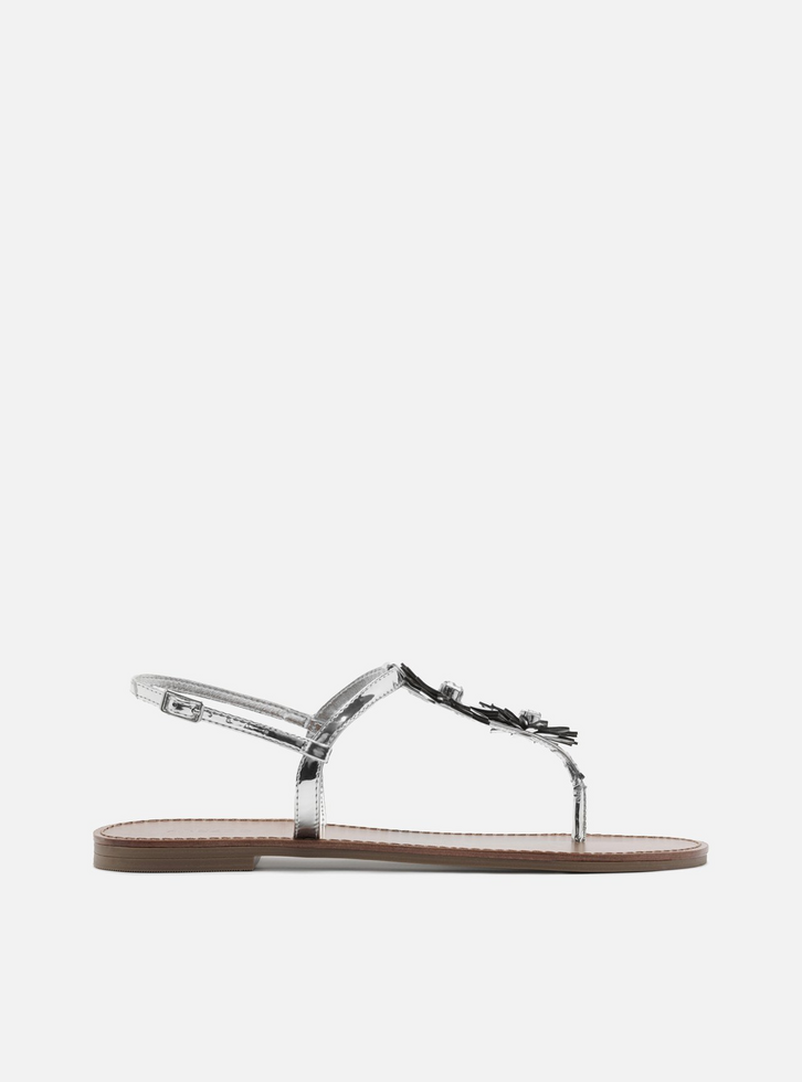 Sandália rasteira feminina prateada. O sapato tem sola flat e formato arredondado na ponta. Traz tira fina que passa entre os dedos, com aplicação de flores, conectada a mais uma tira fina na horizontal na parte superior do pé. Possui ainda tira fina em torno do calcanhar com fecho em fivela metálica lateral. Com palmilha marrom lisa, contorno em pesponto e inscrição do nome da marca. Aberta, a sandália exibe todo o pé.