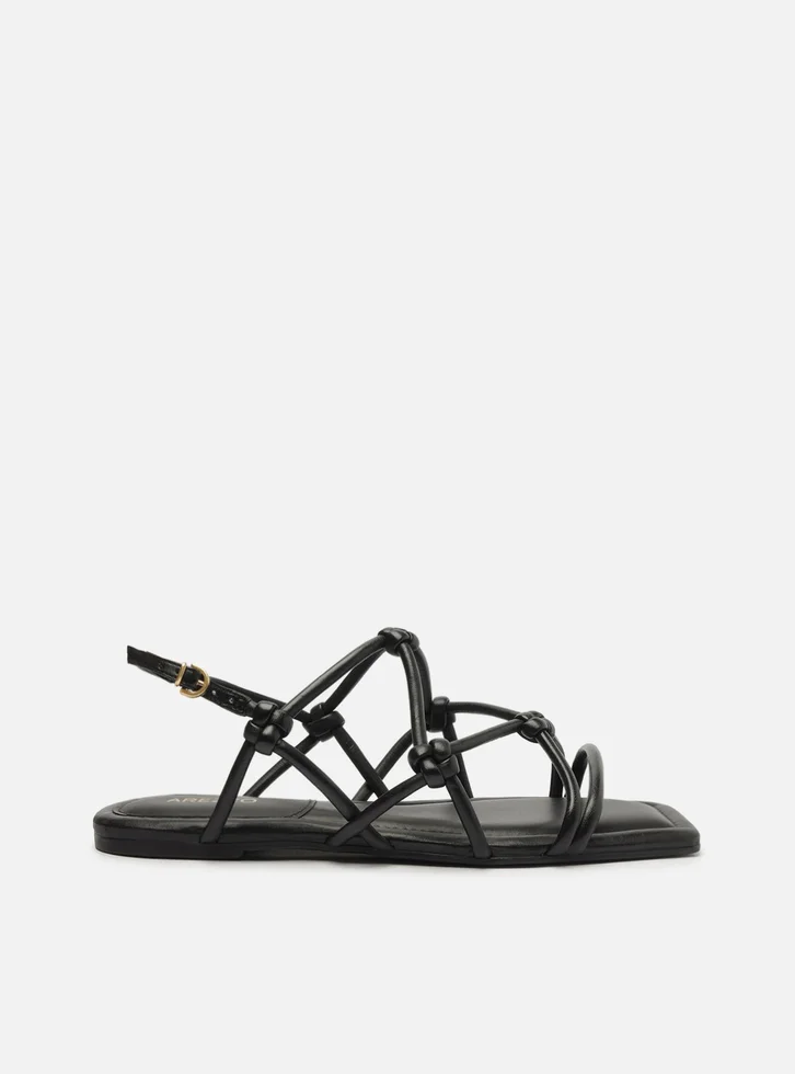 Sandália preta. O modelo tem salto rasteiro e bico quadrado. Traz tiras finas sobre os dedos, todo o peito do pé e nas laterais, unidas por nós. Com fecho em tira em torno do calcanhar e fivela metálica lateral. A sandália é aberta e exibe todo o pé.