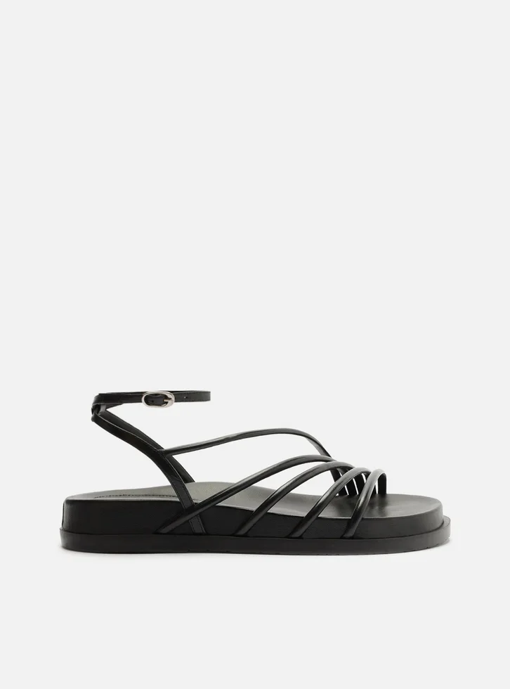 Sandália papete preta de couro. O sapato tem salto rasteiro, palmilha com formato anatômico e nome da marca. Possui solado flatform, base emborrachada e formato arredondado na ponta. Traz tiras finas sobre os dedos e a parte superior do pé, na diagonal. Possui ainda tiras finas que saem das laterais, se cruzam no calcanhar, contornam o tornozelo e fecham em fivela. A sandália é aberta e exibe todo o pé.