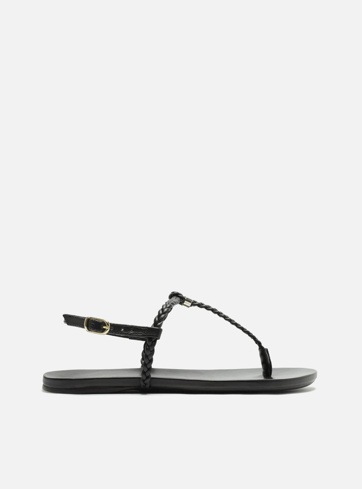 Sandália rasteira preta. O modelo slim tem sola flat e bico redondo. Traz tira fina trançada, que passa entre os dedos e com detalhe metálico, conectada a mais uma tira fina trançada no peito do pé. Possui ainda tira fina lisa em torno do calcanhar com fecho em fivela metálica lateral. Com palmilha da cor do modelo e inscrição do nome da marca. Aberta, a sandália exibe todo o pé.