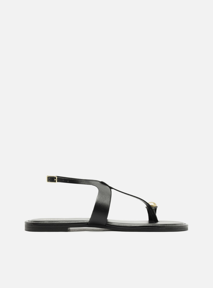 Sandália feminina preta em couro. O sapato tem salto rasteiro e formato arredondado na ponta. Traz tira slim que divide os dedos e tira dedeira com aplicação de metal orgânico dourado escovado. Possui tira recortada na parte superior do pé, conectada à tira fina no tornozelo com fecho em fivela metálica lateral. Com palmilha da cor da sandália e inscrição do nome da marca.
